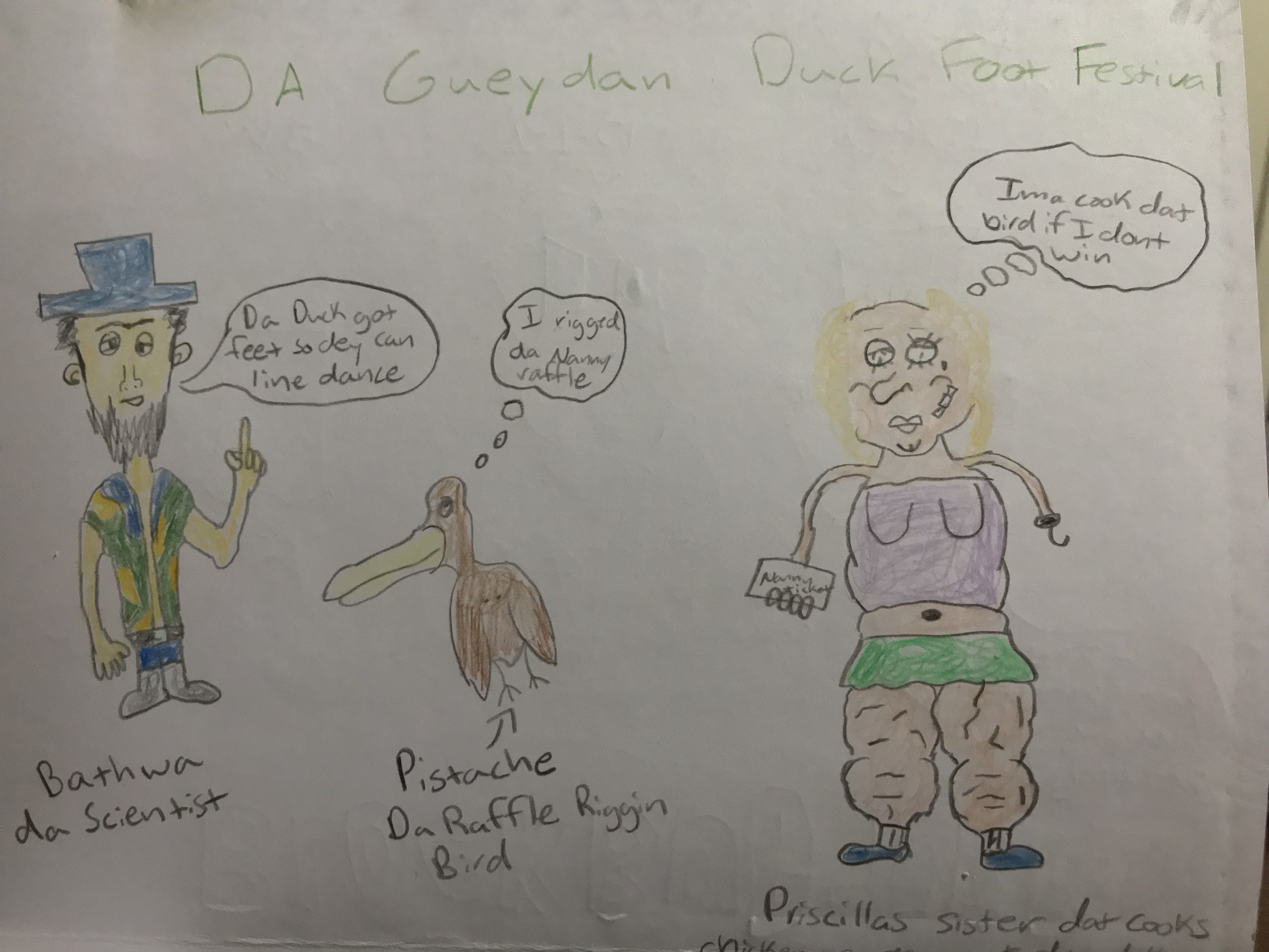 An den I saw Mr Gerard’s tractor an I remembered dat he leaves his cast-net bak dere. My plan wuz 2 stand on top of da tractor an throw da cast-net on top of Priscilla hed. An den da cast-net wuld wrap around her hair like a hairnet. Afta noticin she had a hairnet on she wuld go cook me a gumbo.