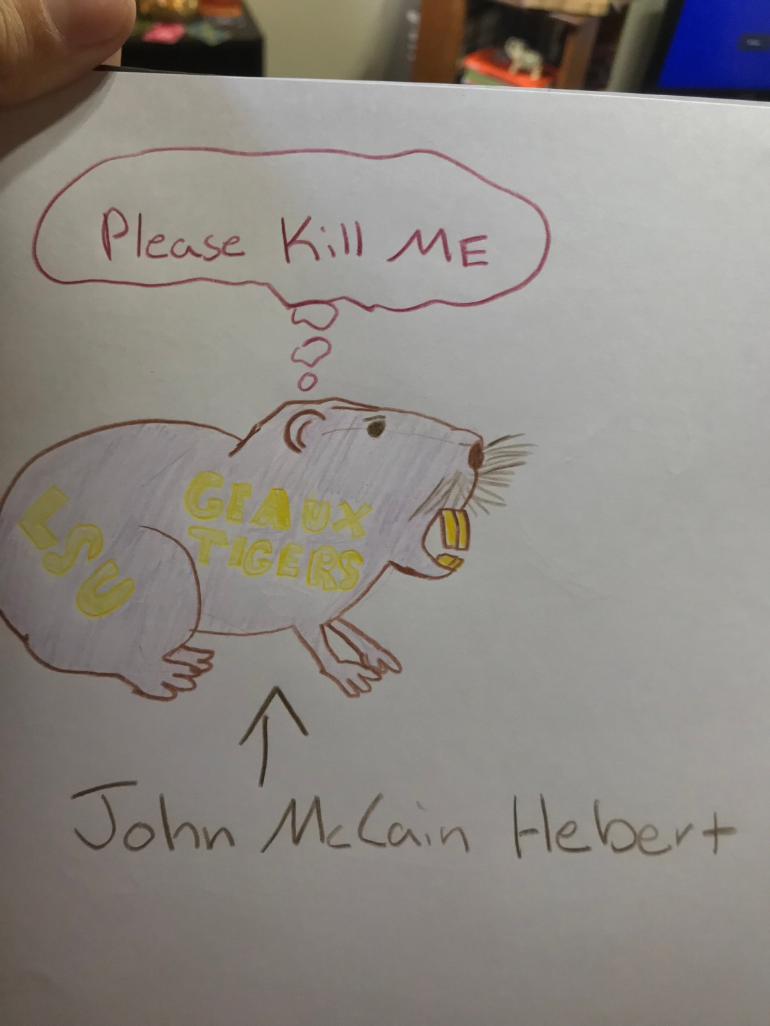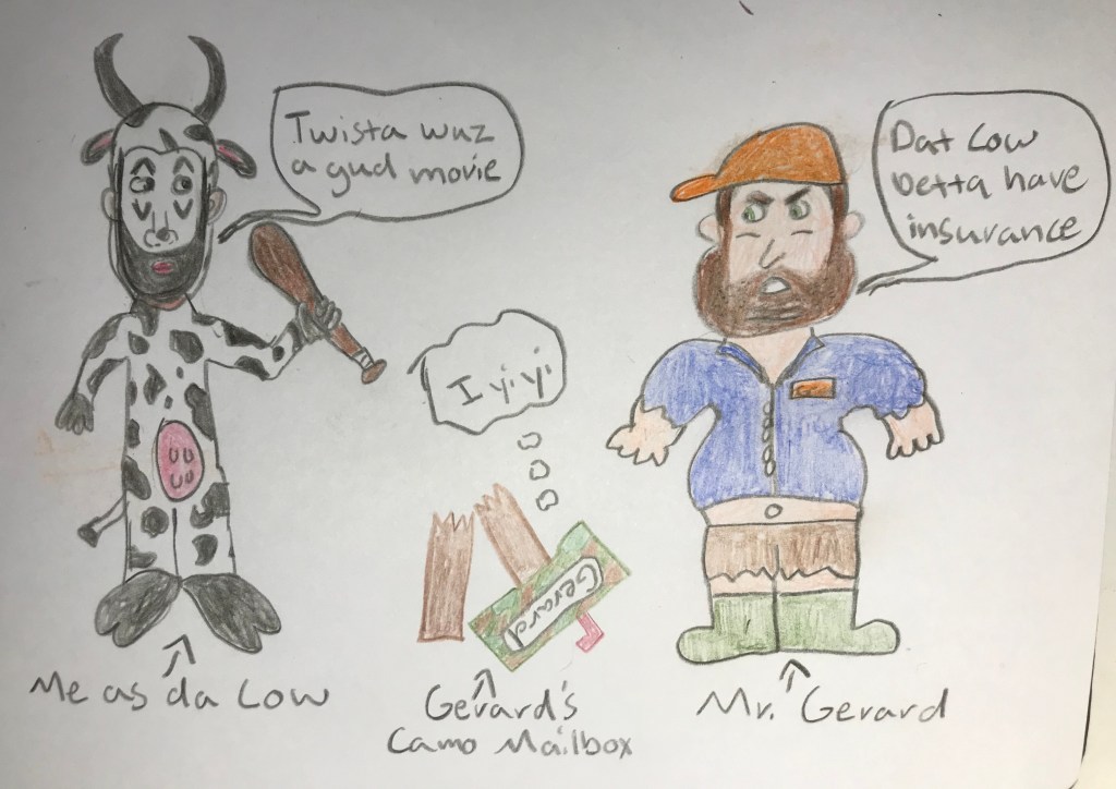 Da tow truck man got out he truck an sed “Priscilla, dat u?” Priscilla sed “Eloi?” I sed “how y’all kno each udder?” An she sed “he da lass man 2 eat mah tuh-tut”. Den Eloi, who is an alligata, sed “its not mah fault. I thought I wuz steelin crab bait.” I sed 2 Eloi “u lucky I needa liscense 2 shoot u!” An he sed “u not gonna talk 2 me like dat! Im gonna go get Etiennes wife out of a bathtub insted!” An I sed “gud luck fittin all u podnas on her wen u go tiki tubin! She only a 1978 Maurice Bank Teller!” An den he did a donut n mah yard an I thought dat wuz cool.