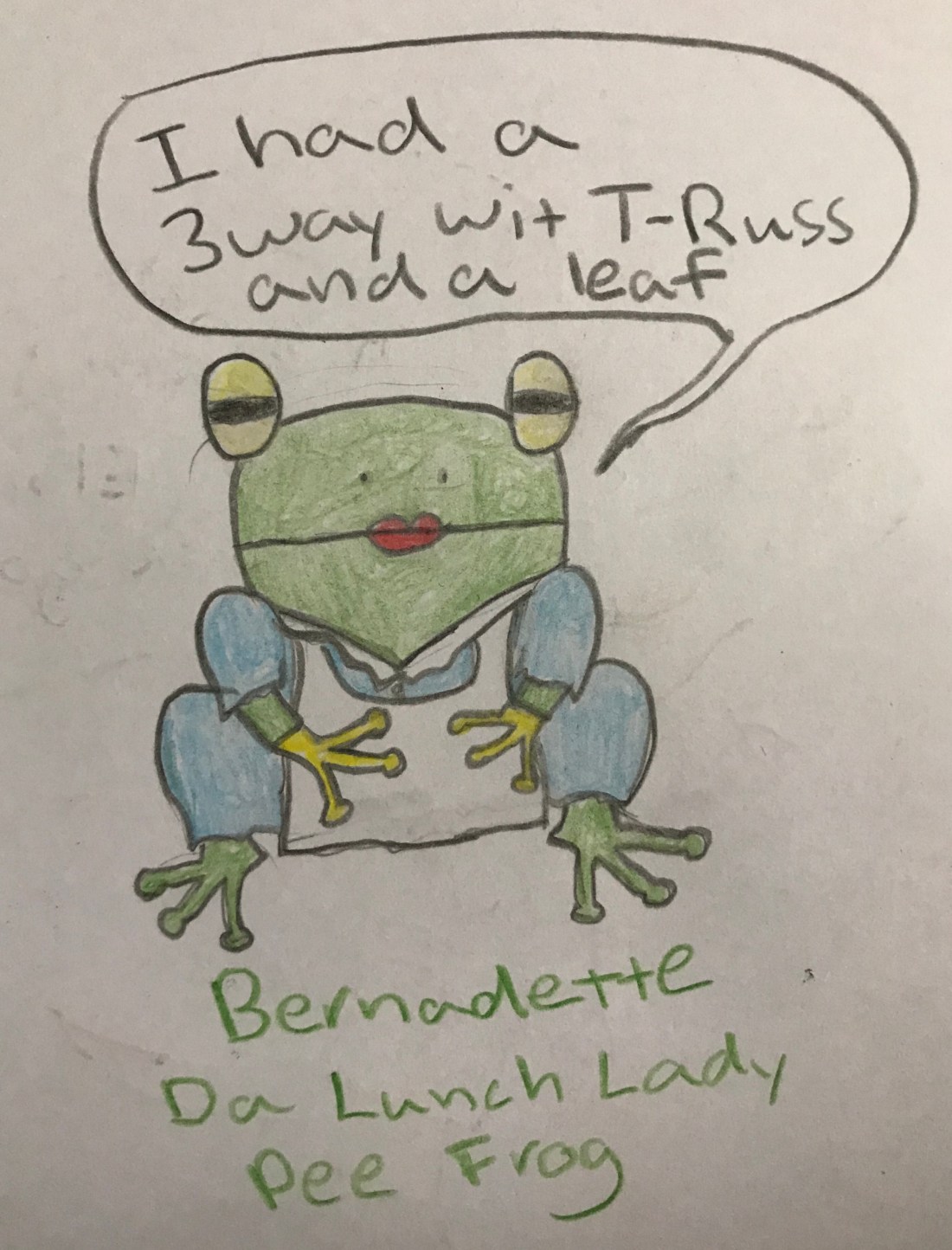 Priscilla den say “If u wanna leeve me I undastan. U neva ate mah tuh-tut anyway. U juss tink im gross an fat.” An I sed “yeah u gross an fat. But dat wut I like abot u. I grew up tinkin Meatloaf wuz da sexist lady an I told maself wen I wuz young ‘if I can’t have Meatloaf, Ima git sumbody grosser an fatter.’ An as far as eatin u tuh-tut. U know dat I dont do dat cuz Im scared mah face paint will make u tuh-tut luk like da Crow.” An she sed “Yes tank u 4 protectin me frum peeple dat mad at Bruce Lee. Ima git out da mud now 2 go cook u gumbo.”